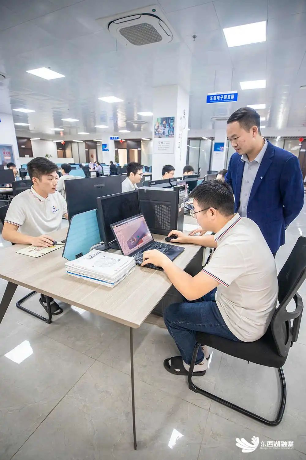 范水根(右)在车载电子研发部现场指导。