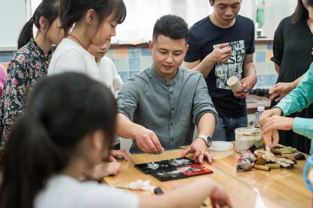 吴星(中)现场教小学生制作漆画(受访者供图)