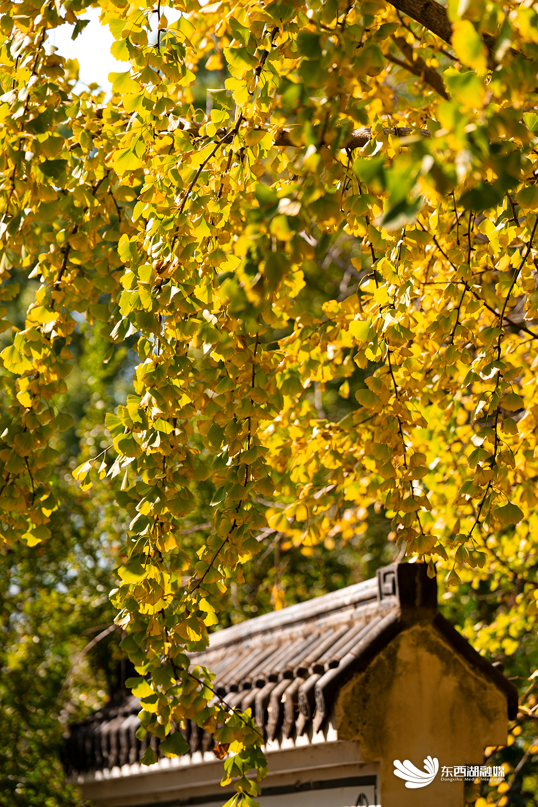 改造一新的白墙黛瓦掩映在金色瀑布之下,更添古朴风韵。一阵风过,摇落一地金黄。
