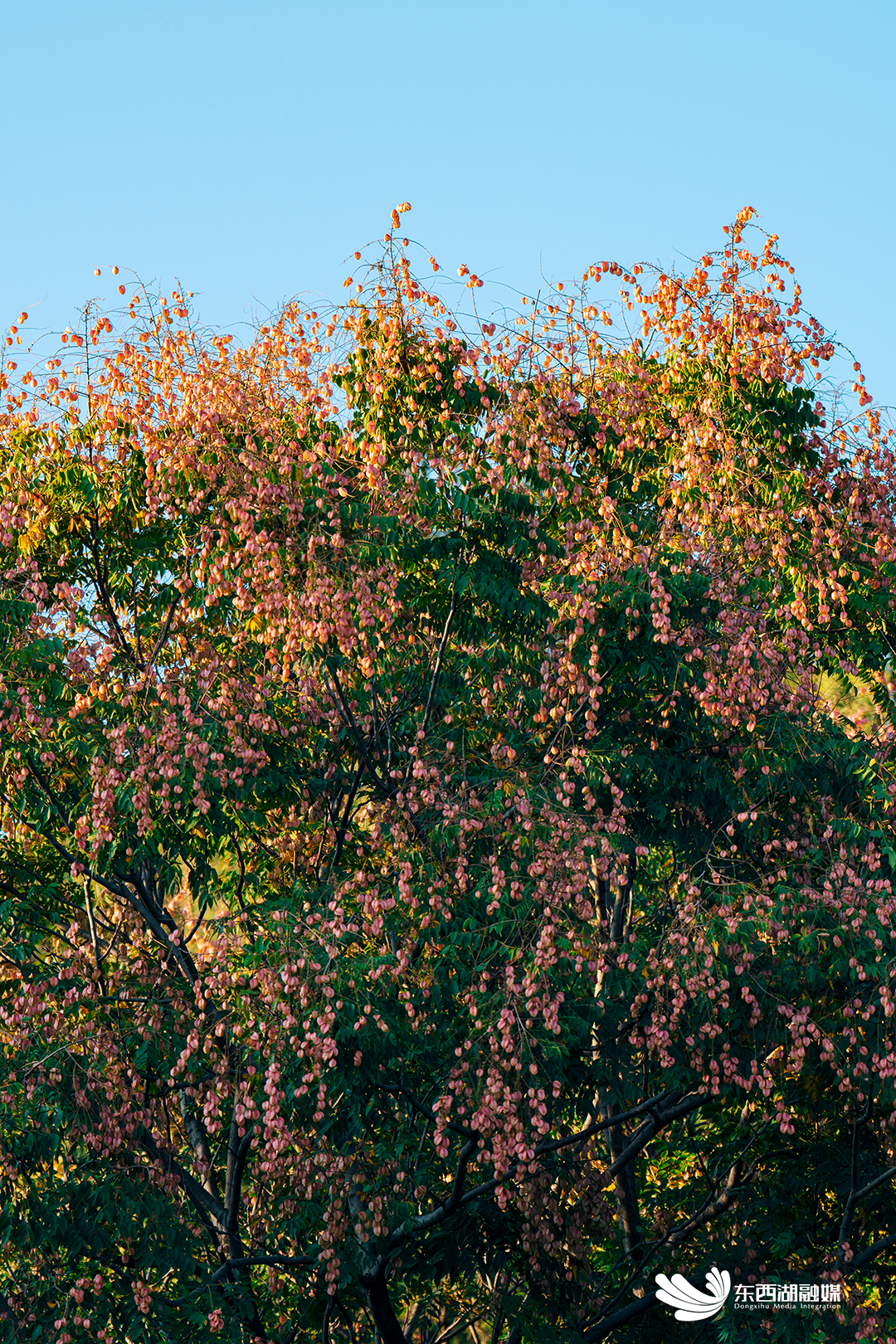 水杉镀上一层金黄,常绿乔木穿针引线,编织成一条暖色围巾;栾树头顶开满细碎的黄花,红色灯笼果在枝头晃晃悠悠,随风飘落满地诗意。