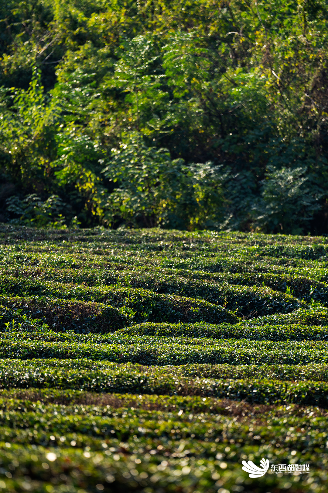 漫山遍野的茶树层次分明地分布在山陇梯田间。即使到了秋天,也身披绿衣,为东西湖留住一片绿海。