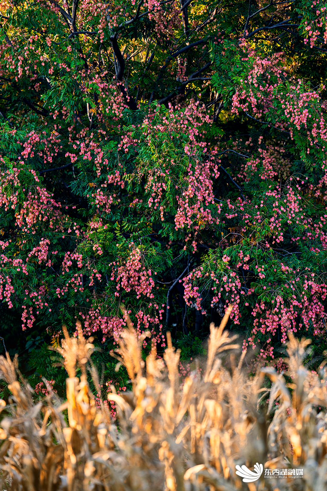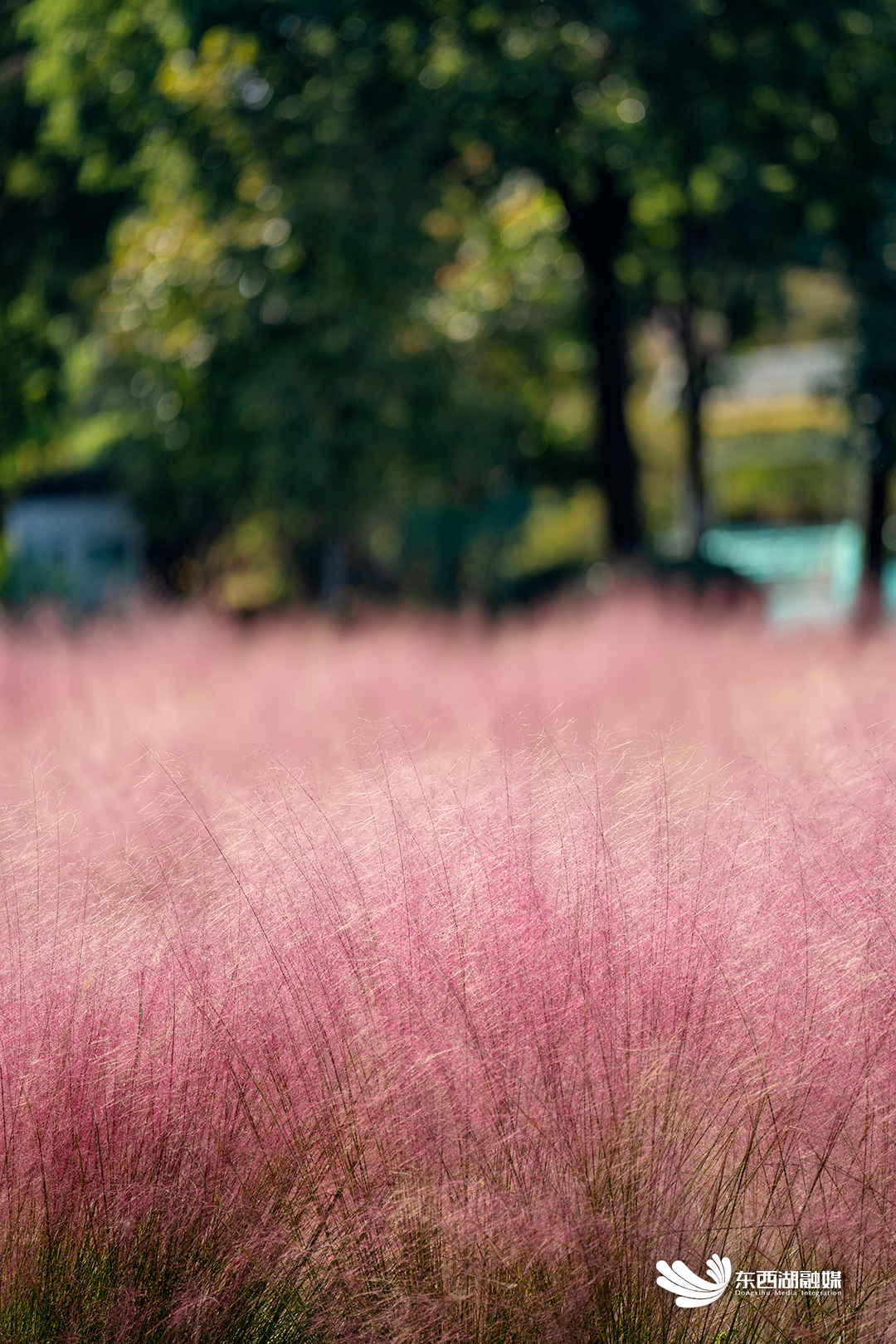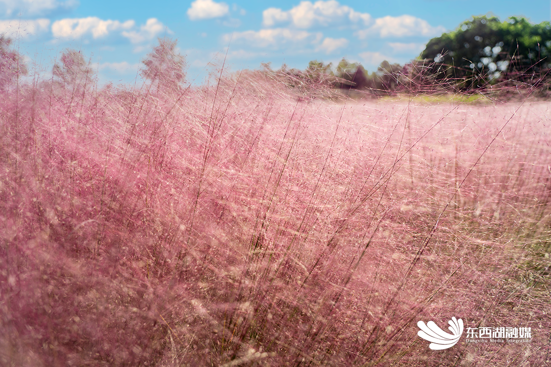 如烟如霞的粉色花穗,轻轻柔柔,连成巨幅缱绻纱幔。秋风一起,粉色花海就荡漾起微波,如梦似幻。