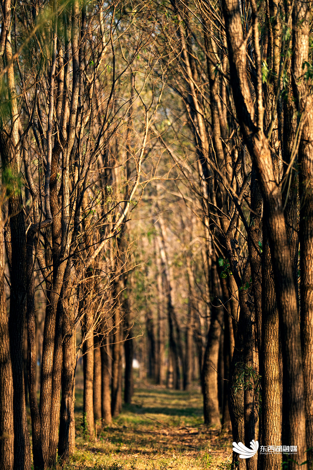 东西湖大堤广袤绵延的防护林,落叶之后,枝条的脉络清晰可见。