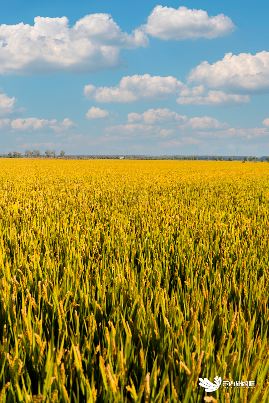 站在田间小路远眺,一片片稻田好像金黄绸缎绵延到天际,与蓝天白云交相辉映,宛如一幅清新的秋日画卷。