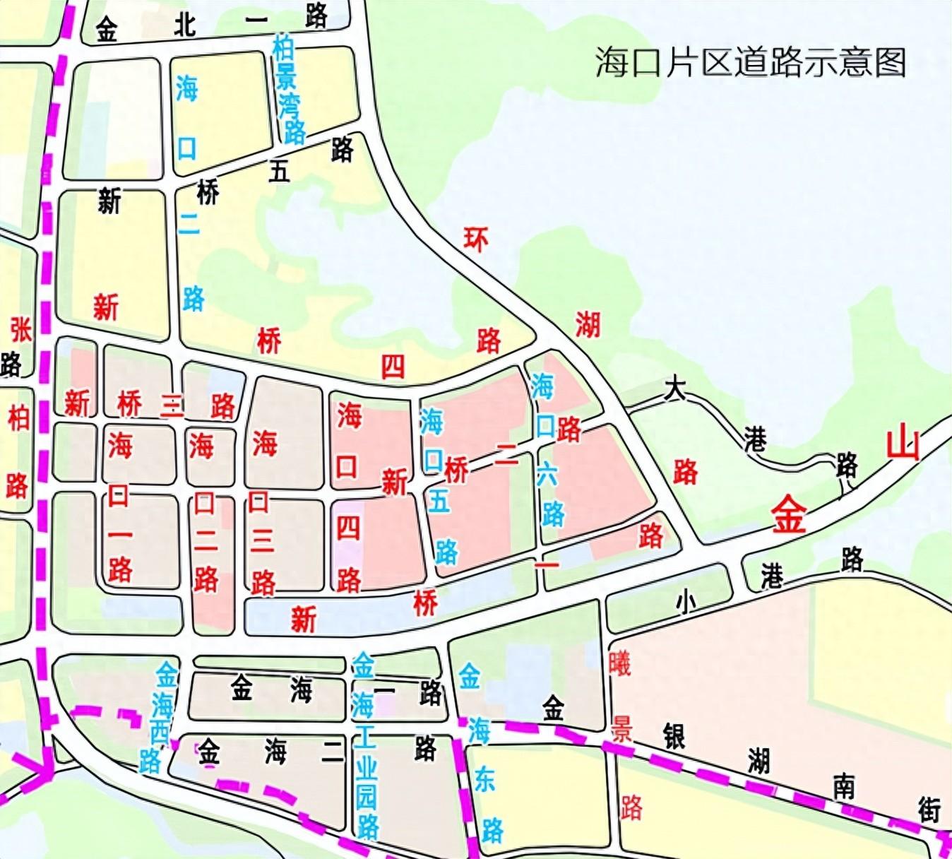 海口片区东起环湖路,西至张柏路(硚孝高速),北临径河,南跨金山大道至张公堤,地处金银湖水域西南侧,接壤径河街、吴家山街与硚口区。片区12条道路品质提升工程,主要内容为修复路面通行功能,完善道路配套设施,增设人非通道和绿化带等慢行设施。