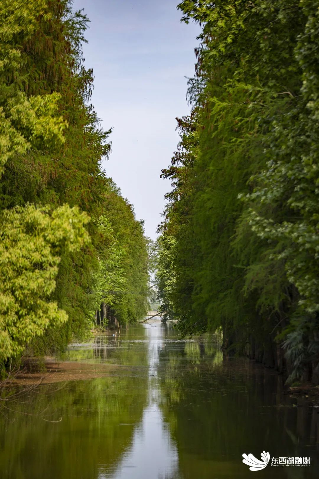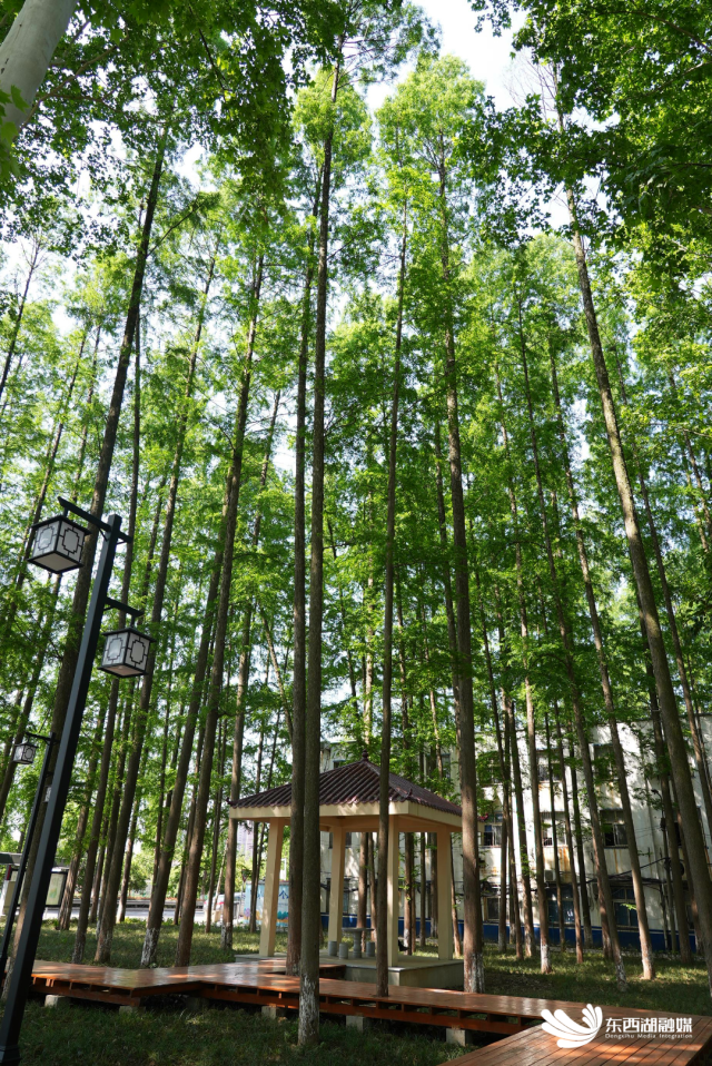 月牙湖社区四面环水的同时,沟渠边皆种植的是高耸入天的水杉树。