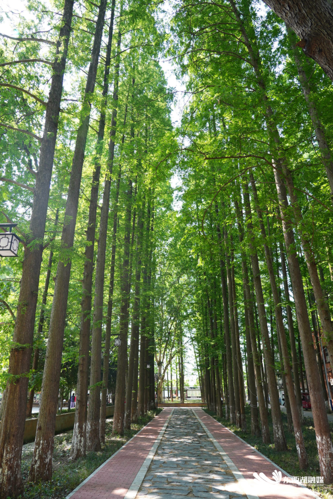 月牙湖社区两旁道路均水泥硬化并安装了护栏,行走在道路上,全是水杉绿荫,置身其中犹如秘境探幽。