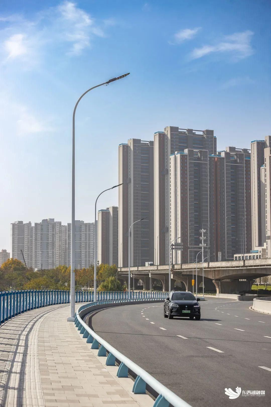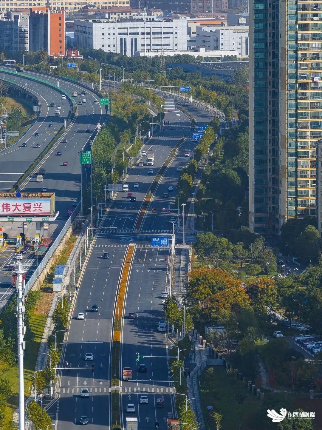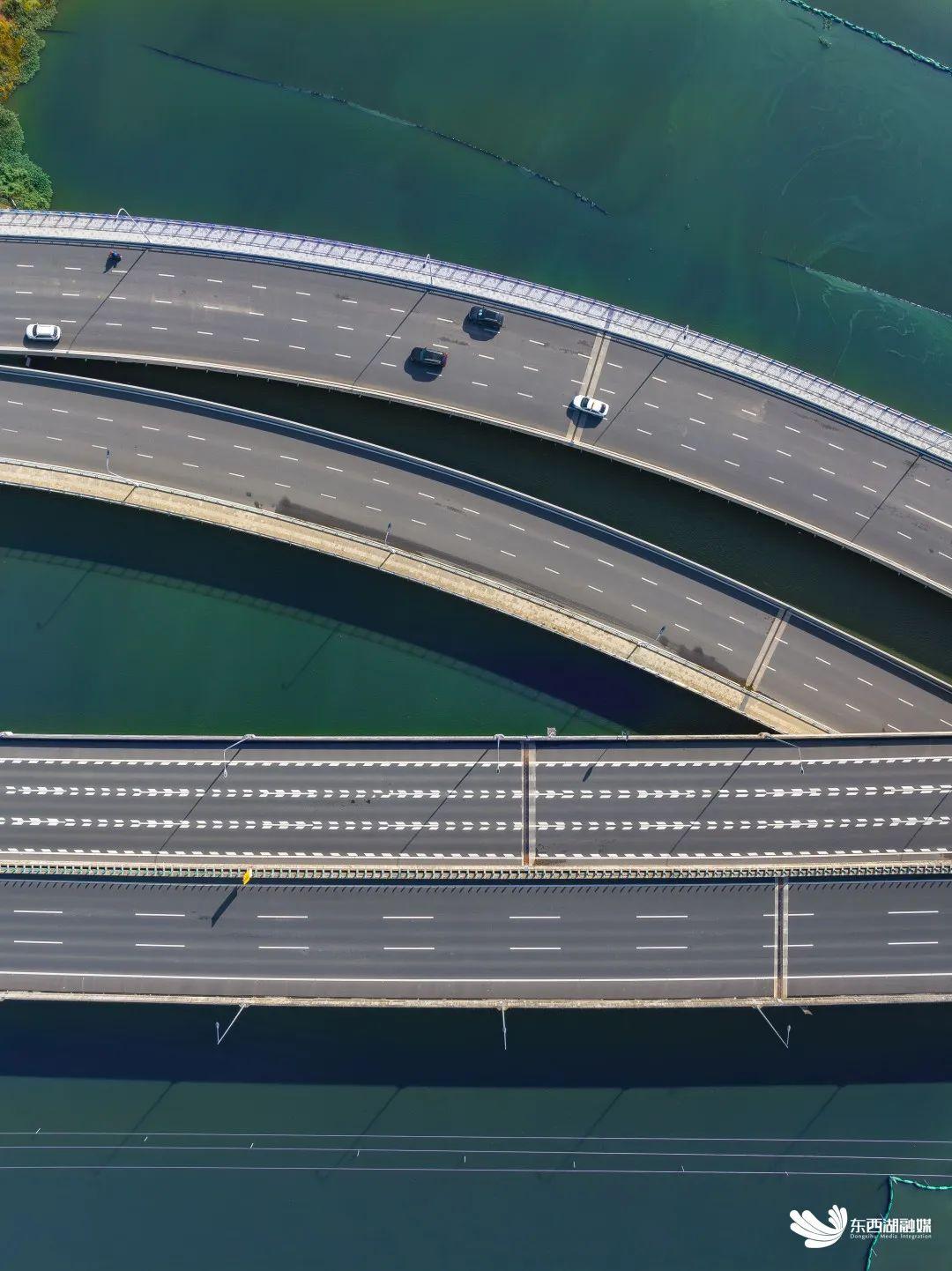 新建桥梁环抱高速桥墩灵动而建,道桥分合有序、衔接自然顺畅。