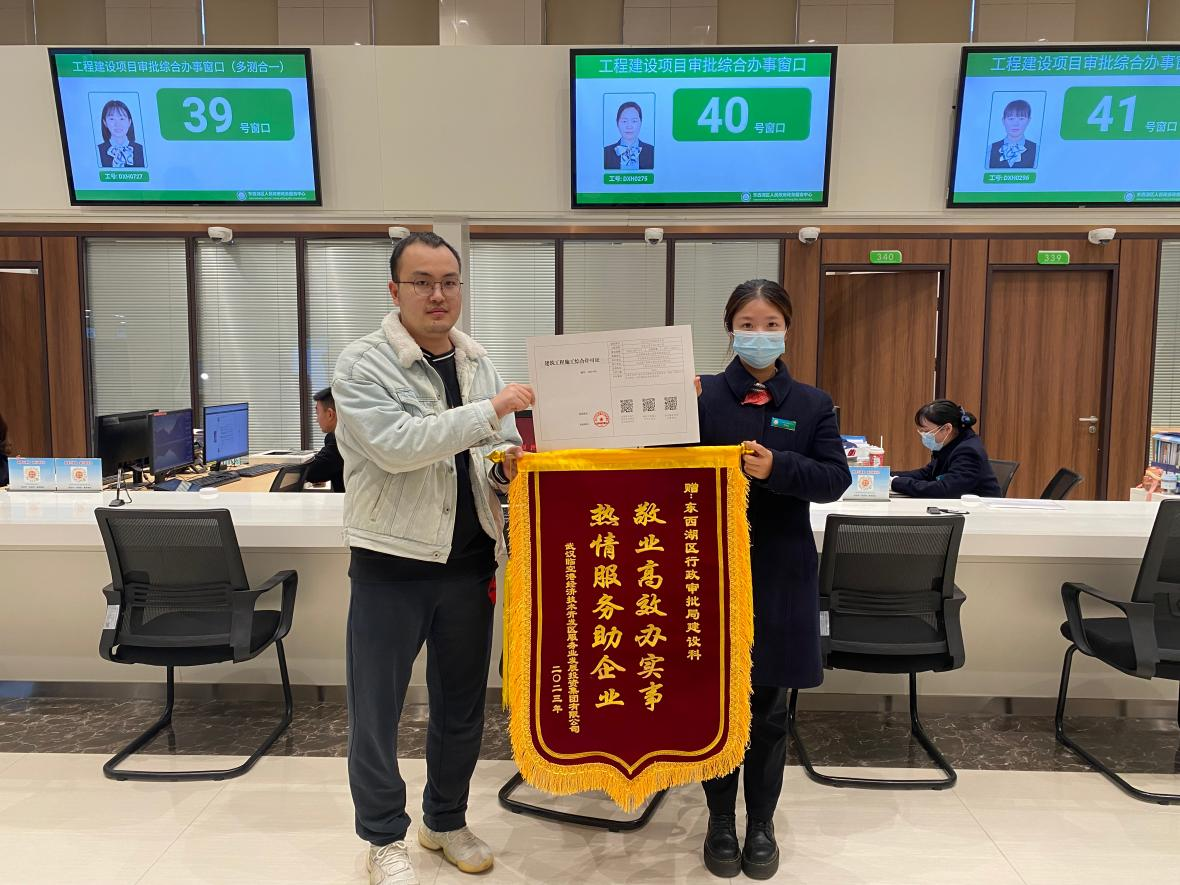 “感谢你们让我们快速领取到了建筑工程综合许可证。”近日,东西湖区吴家山四中改扩建项目负责人在东西湖区政务服务中心领取了建筑工程综合许可证后,为东西湖区政务服务中心送来锦旗,为高效服务点赞。
