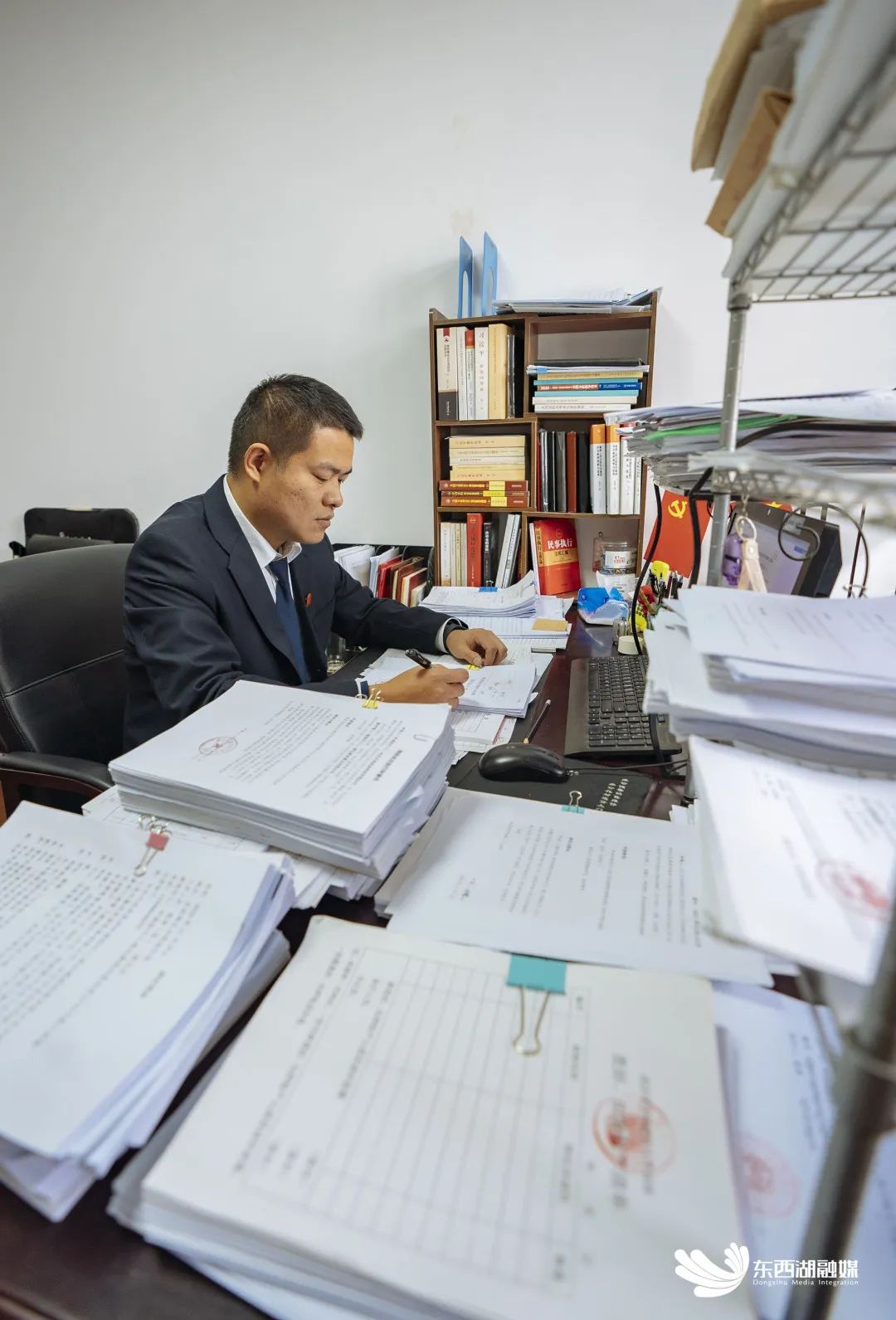 案件卷宗摆满了案头,放不下的,添了置物架放在办公桌上。身高一米八三的张清,埋头扎在材料堆里。他身边的简易书柜上,《民事执行》《保全与执行》等专业书籍塞得满满当当。