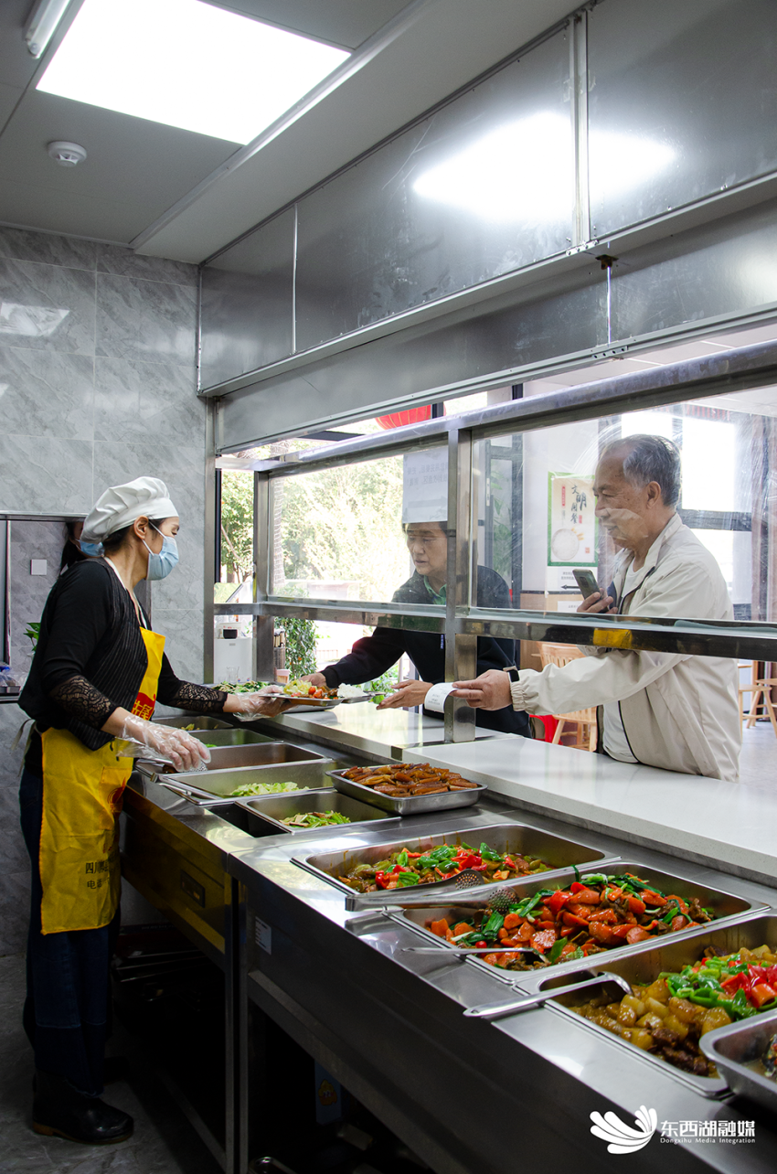 今年10月,常青花园党群服务中心幸福食堂正式营业,食堂紧挨着提档升级后的老年大学、阅览室以及便民服务中心。用餐时段,任选两荤一素的套餐售价15元,60周岁以上老人打8折,还有免费供应的粥、汤和米饭。