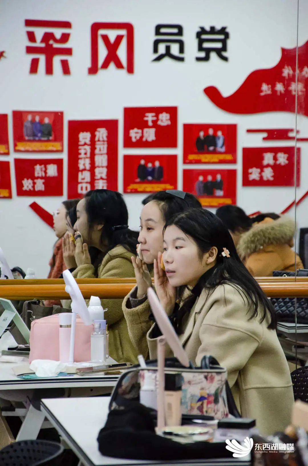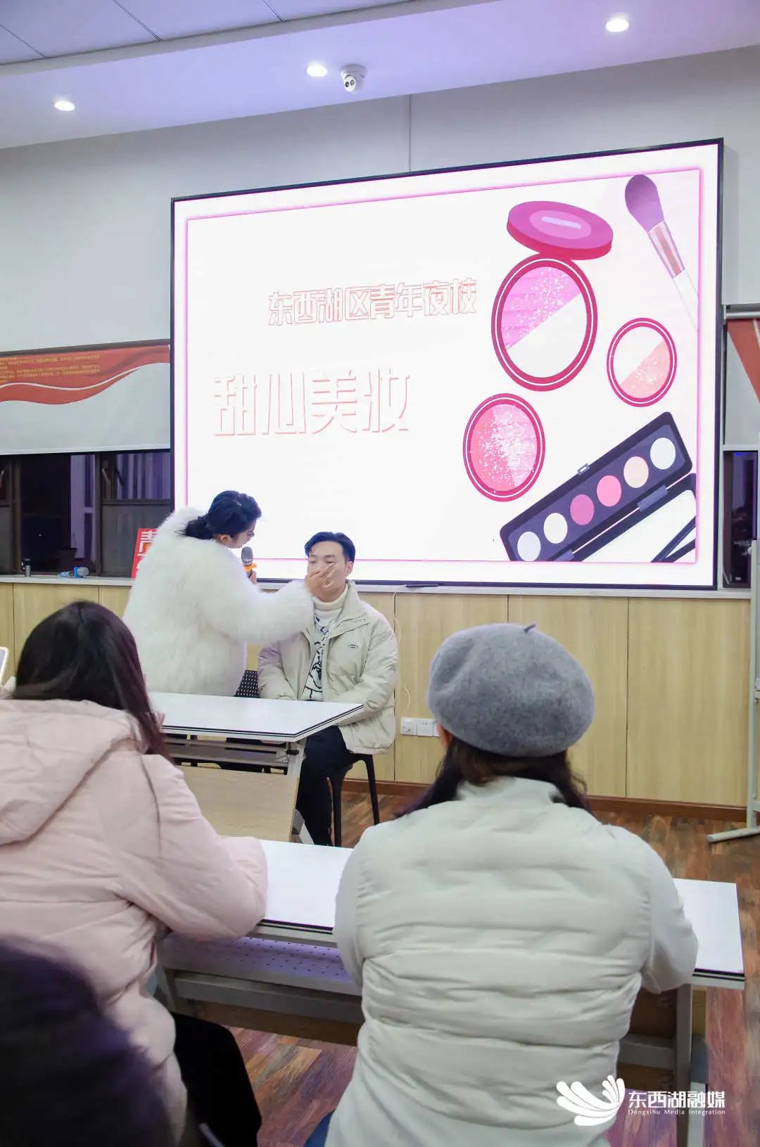 12月14日晚,气温骤降,天空飘起了小雨。在金银湖花城社区党群服务中心的“甜心美妆”课堂上,一名资深化妆师以一名男模特为示范,正耐心地为大家讲解:“首先我们拿出镜子来,面对我们的脸,我来教大家分辨我们的脸是‘冷’还是‘暖’。”近40名女性青年坐在课桌前,带上全套化妆用品和美妆镜,学习和上手实操化妆。