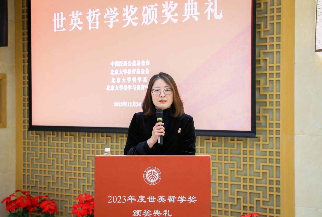 12月24日,2023年度世英哲学奖颁奖典礼在北京大学教育基金会报告厅举行。北京大学党委书记郝平教授,党委常委、副校长、教务长王博教授,文科资深教授、著名美学家叶朗先生等亲临颁奖典礼。来自中国泛海公益基金会、北京大学教育基金会、北京大学哲学系、北京大学艺术学院的嘉宾,以及著名哲学家、美学家张世英先生哲嗣张晓崧先生,张世英先生后学故交、先生家乡张世英书院代表一起参加了颁奖典礼。