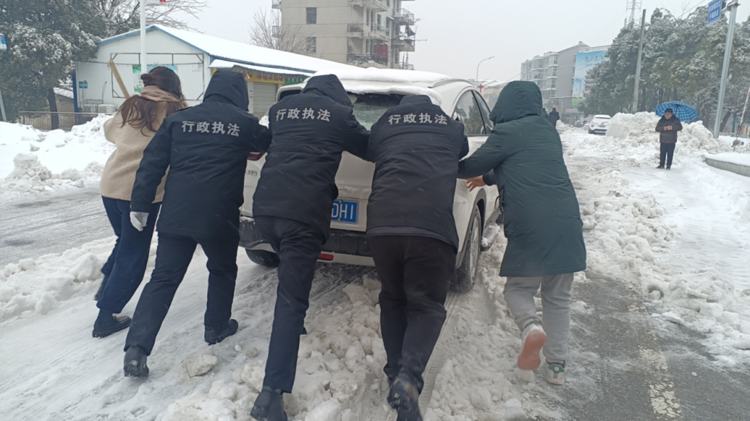 在新沟镇街,综合执法中心70名队员日以继夜巡查主次干道、桥梁、涵洞。遇到车辆打滑,他们秒变“推车侠”,任凭脸上、身上甩满泥水。