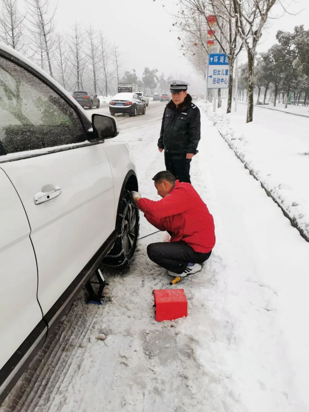 2月4日8时,金山大道早高峰时段,一辆小型汽车在路肩打滑,正在路段巡逻的交警游新平迅速上前解围,疏导交通、指导安装防滑链,一气呵成。