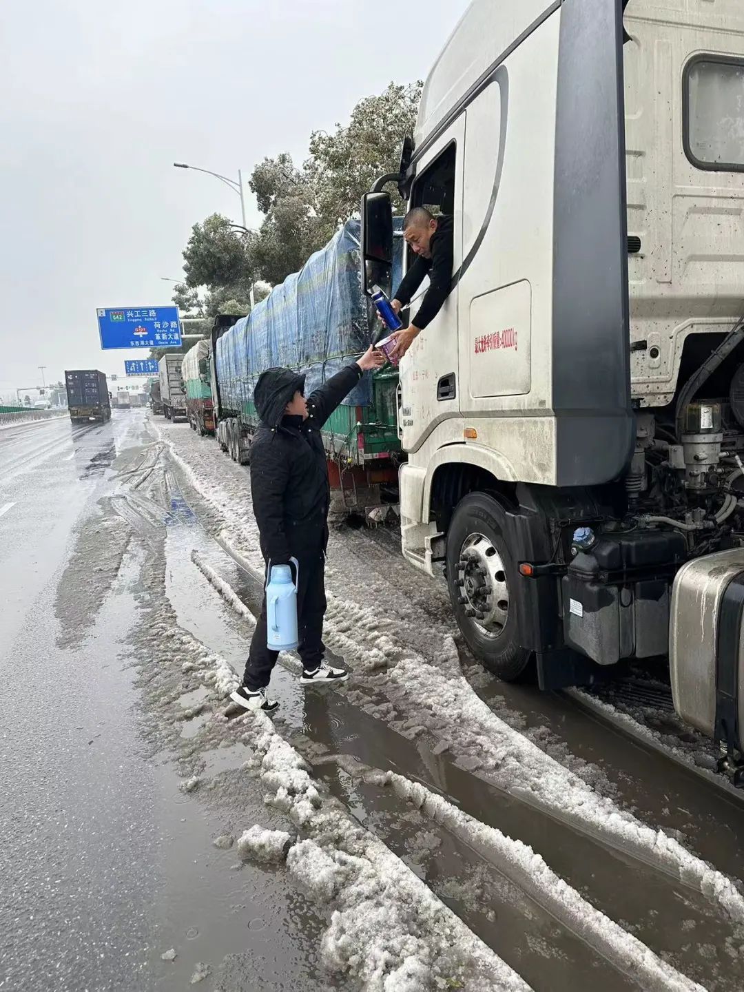 陈赛与队员郭忠义摸底张罗,后方队员先后送带来15壶开水、10箱方便面。大家顾不上除雪清障的疲惫,从货车队尾开始,逐一给有需要的司机送水泡面。