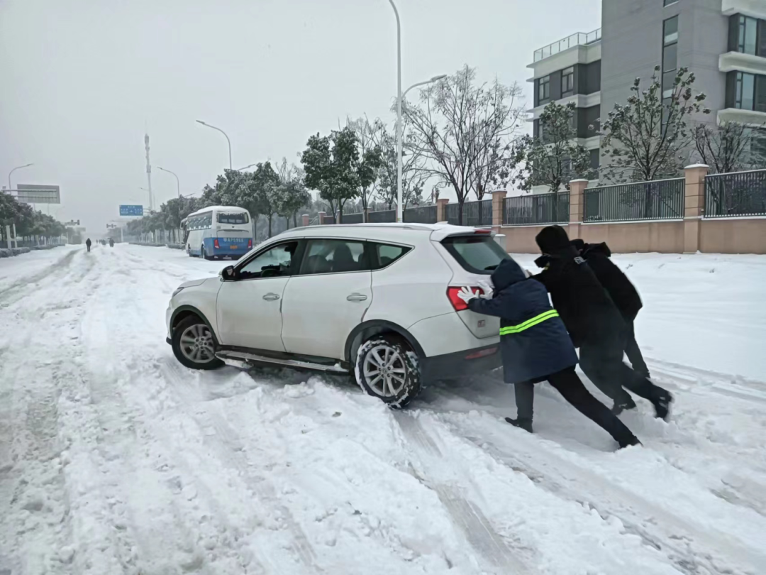 长青街幸福苑,居民袁先生女儿、妻子相继发烧,一行人开车就医,不想车子陷在院内雪中。物业经理曹萌带人看推车不行,立即开来自己的车子,带袁先生一家赶往医院。