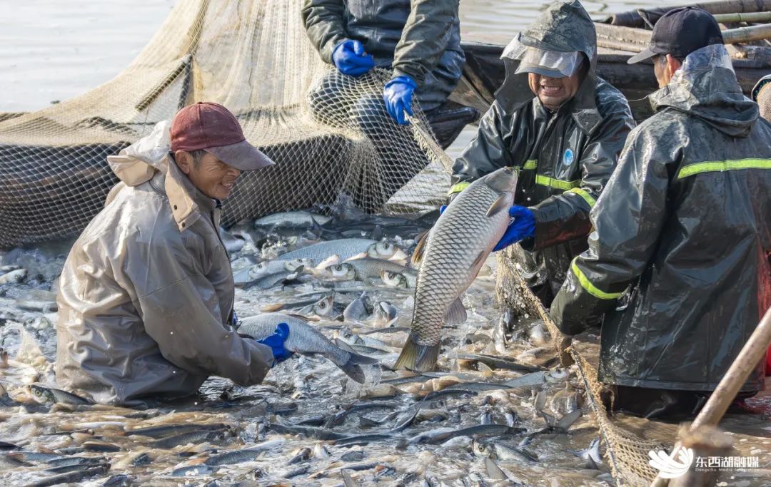 1月31日清晨,东西湖区万亩渔业绿色循环试点基地,伴随“收网、起鱼”的口令,鱼群争相跃出水面。元旦以来,基地起网捕鱼量累计已达300万斤。