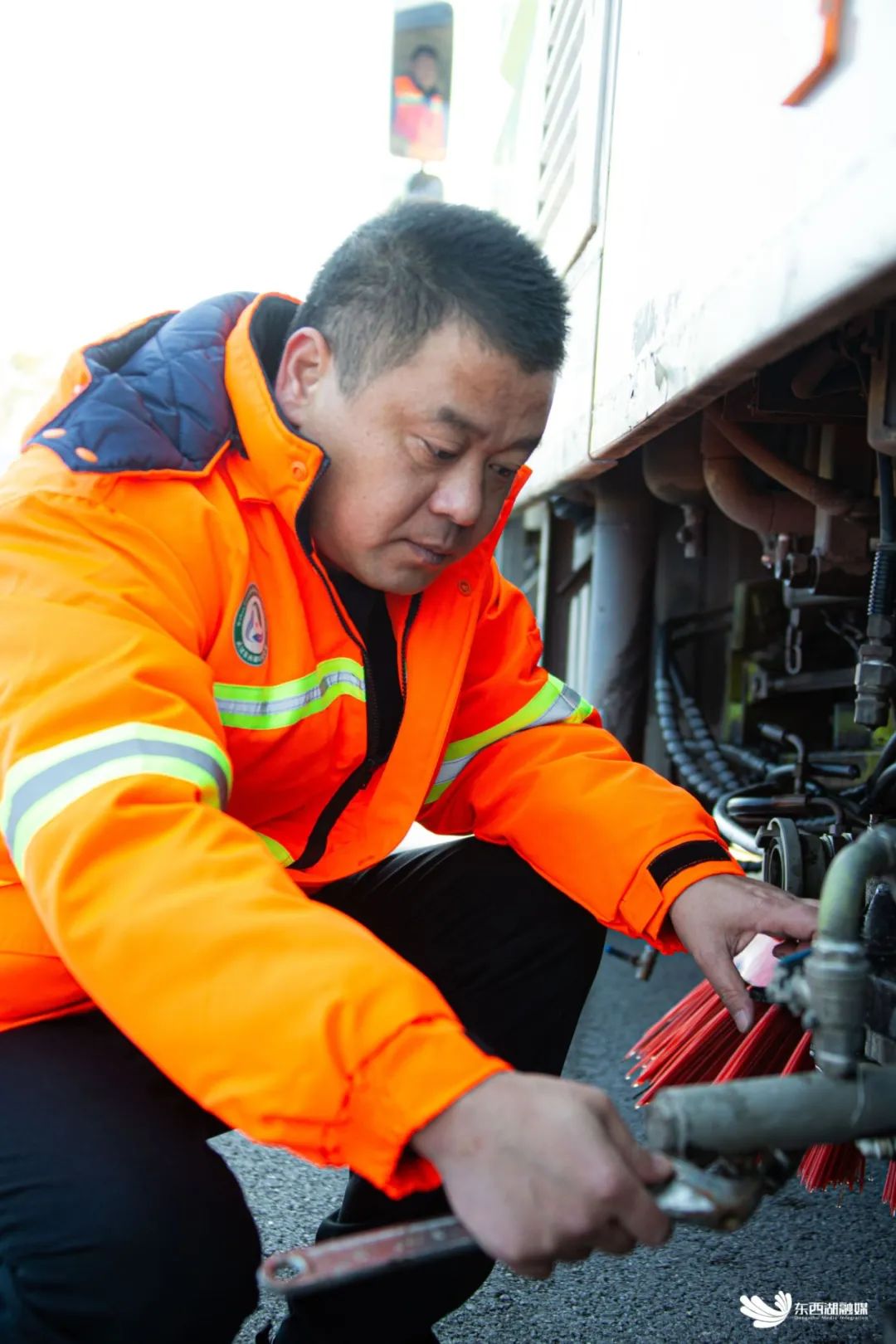 自从事环卫驾驶工作以来,黄彬自学了车辆维修、维护以及现代化汽车管理方面的知识,是名副其实的多面手。“洗扫车下面的小喷头容易堵,影响冲洗效果,小问题都是自己动手解决。”