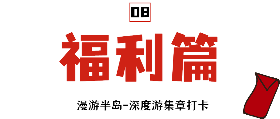 用漫游半岛-深度游集章打卡,完成指定地点盖章打卡任务,即可参与抽红包活动,每满3个章可抽一个红包。红包内含嘻多多、飞乐冒险主题乐园、半岛民宿等园区游览项目免费体验券,最高可获得价值5699元独栋花园别墅免费住宿体验一次(14:00入住,次日12点前退房)。
