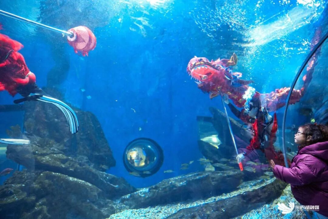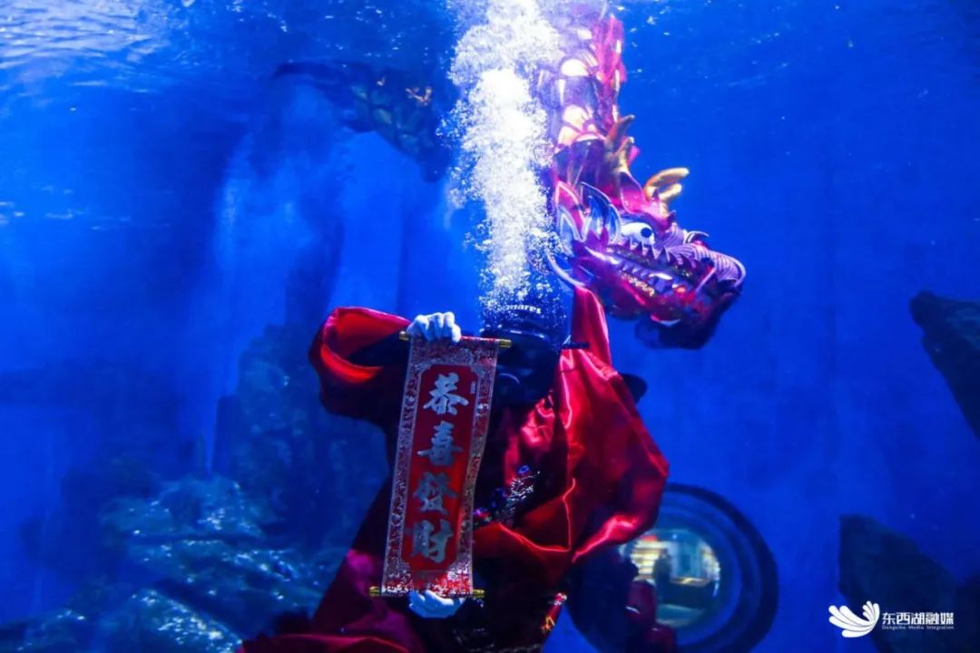 “水下舞龙”海底秀令人叹为观止,仿佛龙腾四海,乘风破浪;“财神赐福”水下喂食秀则是一幅财神与鱼群和谐共舞的奇趣画面,寓意着财源滚滚、年年有余。