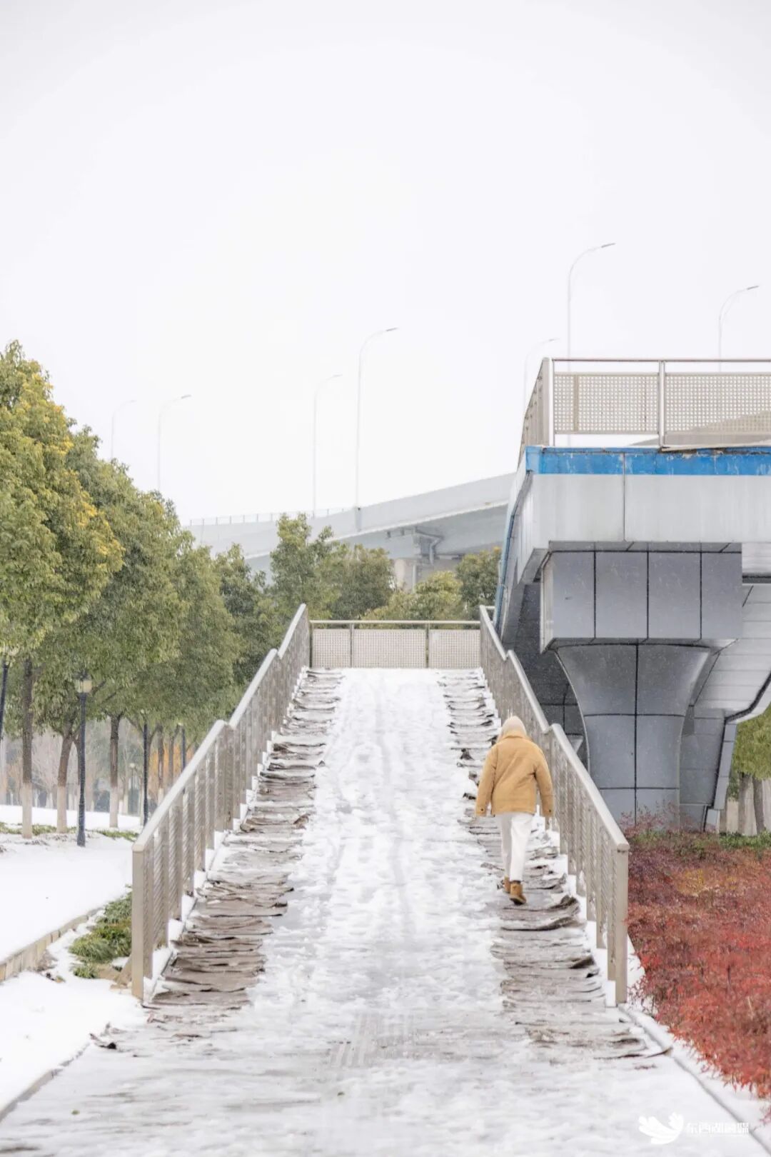 金山大道及周边道路,机动车道畅通有序。金山大道主干道和硚孝高速匝道,通行正常,地铁站、人行天桥等处均铺有防滑草垫。
