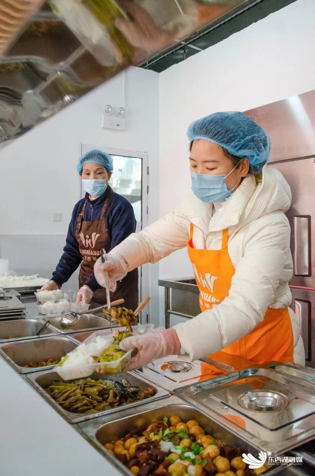 食堂工作人员为居民打饭。
