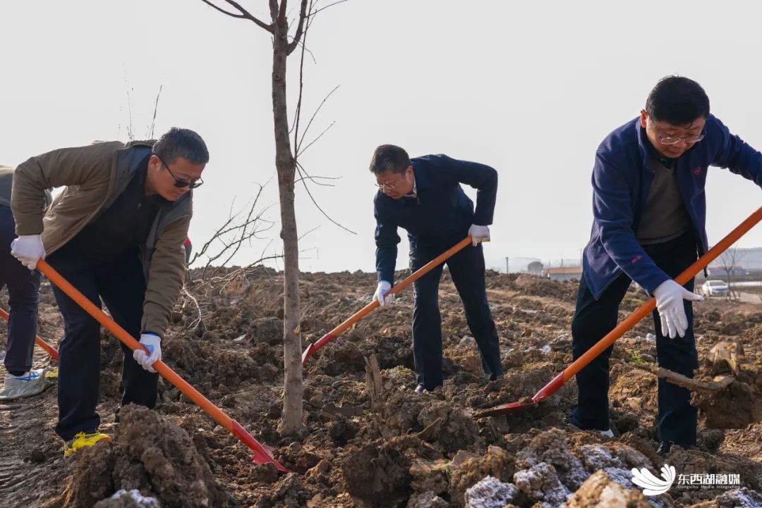 植树现场,彭涛与干部群众一起,拿着铁锹、水桶,剪除根土绷带,扶直树苗、挥锹铲土、培土围堰、提水浇灌……一株株树苗逐渐横成排、竖成列。