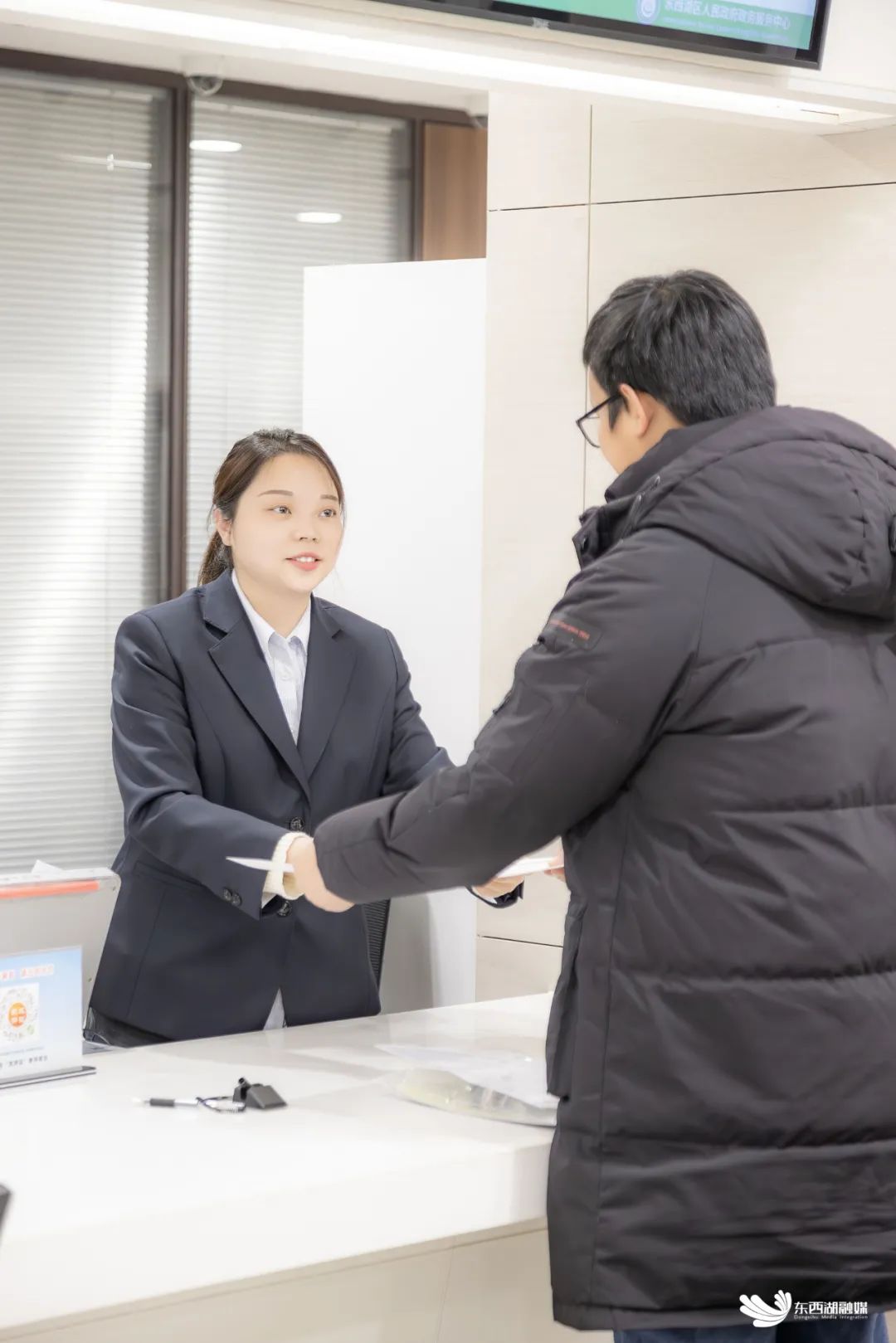 东西湖区行政审批局经济事务审批科工作人员窗口为企业和群众服务。