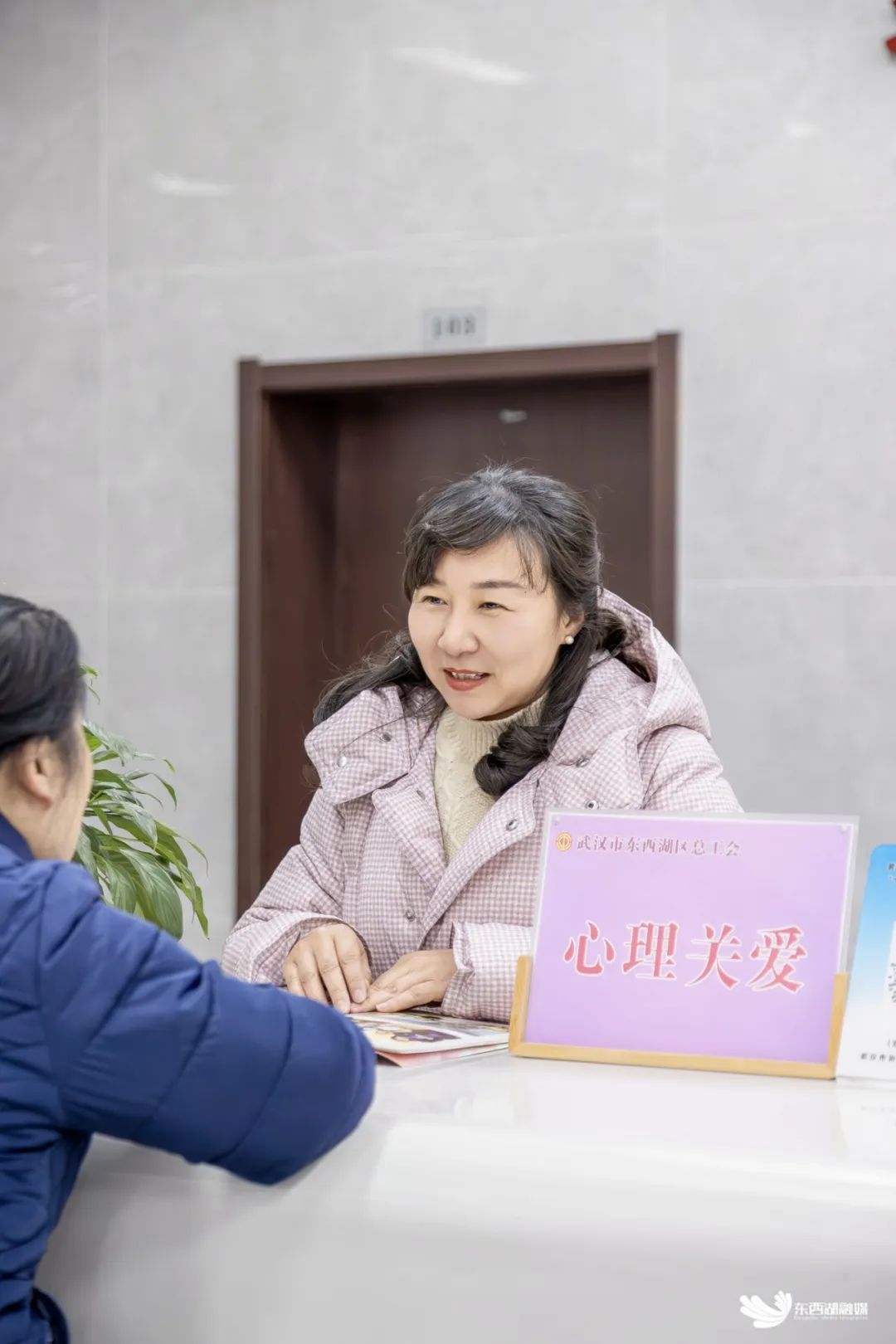 东西湖区总工会困难职工帮扶中心负责人张晓芳为来访者提供心理关爱服务。