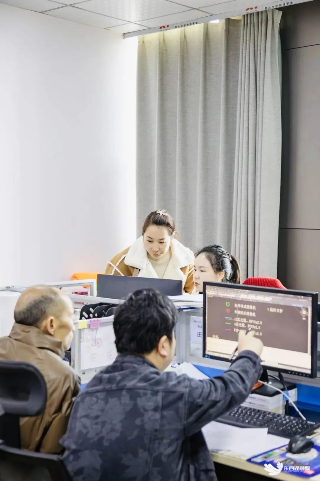 设计人员讨论通信工程项目实施方案。