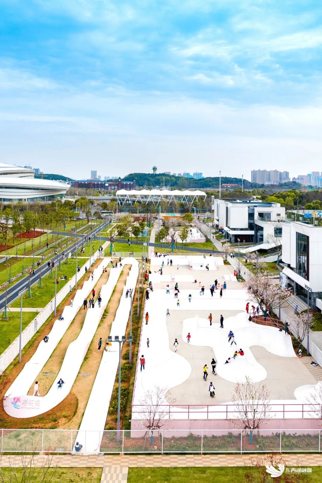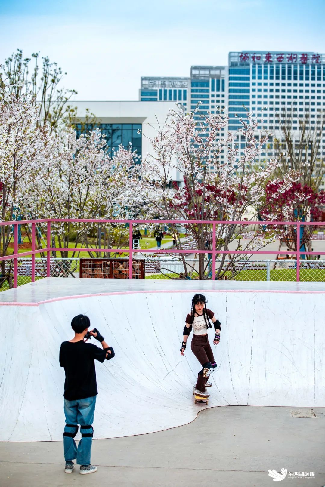 公园内藏有一个高颜值的极限运动场地????,粉白配色与周围的樱花树相映成趣,为运动爱好者提供了一个别样的健身环境。