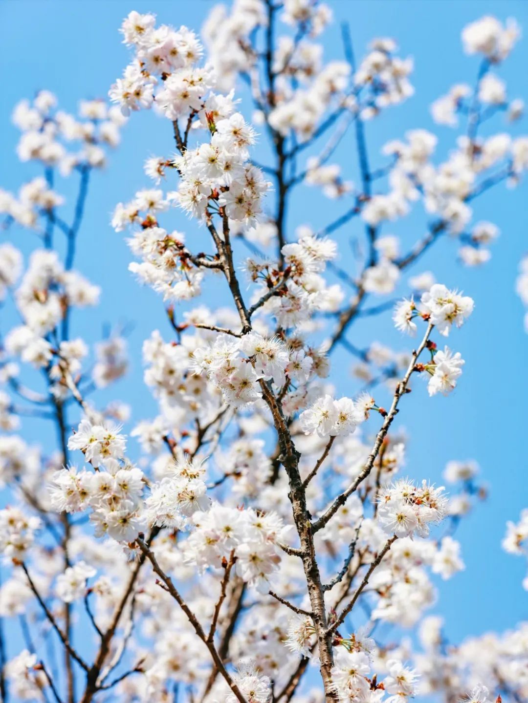 蓝天映衬下,樱桃花朵洁白如玉,福建山樱娇艳如丹朱。