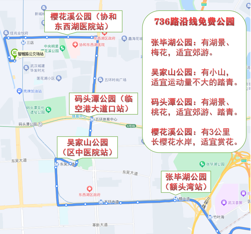 736线路从汉口火车站出发,沿途经过发展大道、长丰大道、东西湖大道、临空港大道,最后到达三店。途中有张毕湖公园、吴家山公园、码头潭公园、中央明渠樱花溪公园等众多开放式的公园,许多公园都有梅花、樱花等当季的花点缀其间。特别是樱花溪公园,3公里长的樱花正含苞待放,很是值得一看。