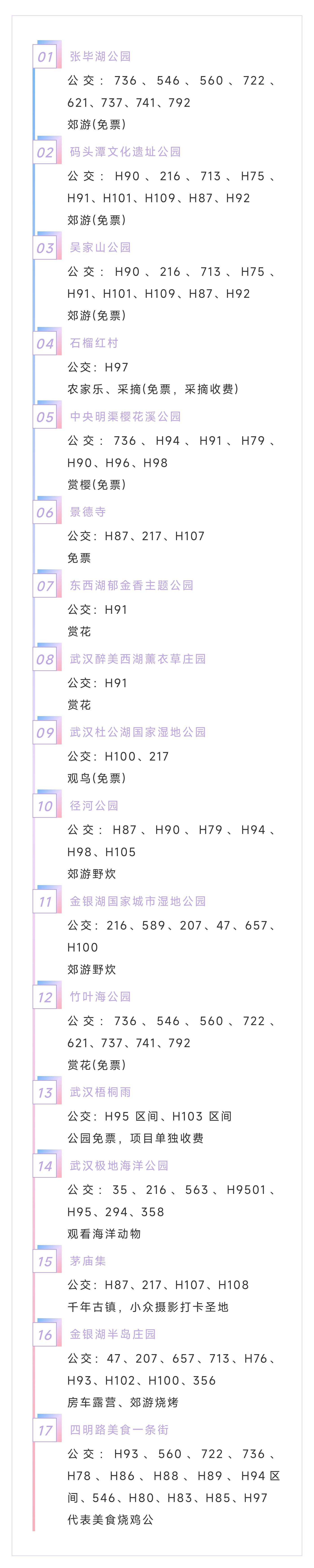 “这些景点都在东西湖,乘坐公交车就可以到,省去了开车出行寻找停车位的不便。”武汉公交集团二公司736线路线长彭亮介绍,为服务好郊游赏花的打卡乘客,线路也贴心地把这些景点的乘车方式一并整理,即将张贴在每一辆736公交车上,有兴趣的市民可以按图索“景”。