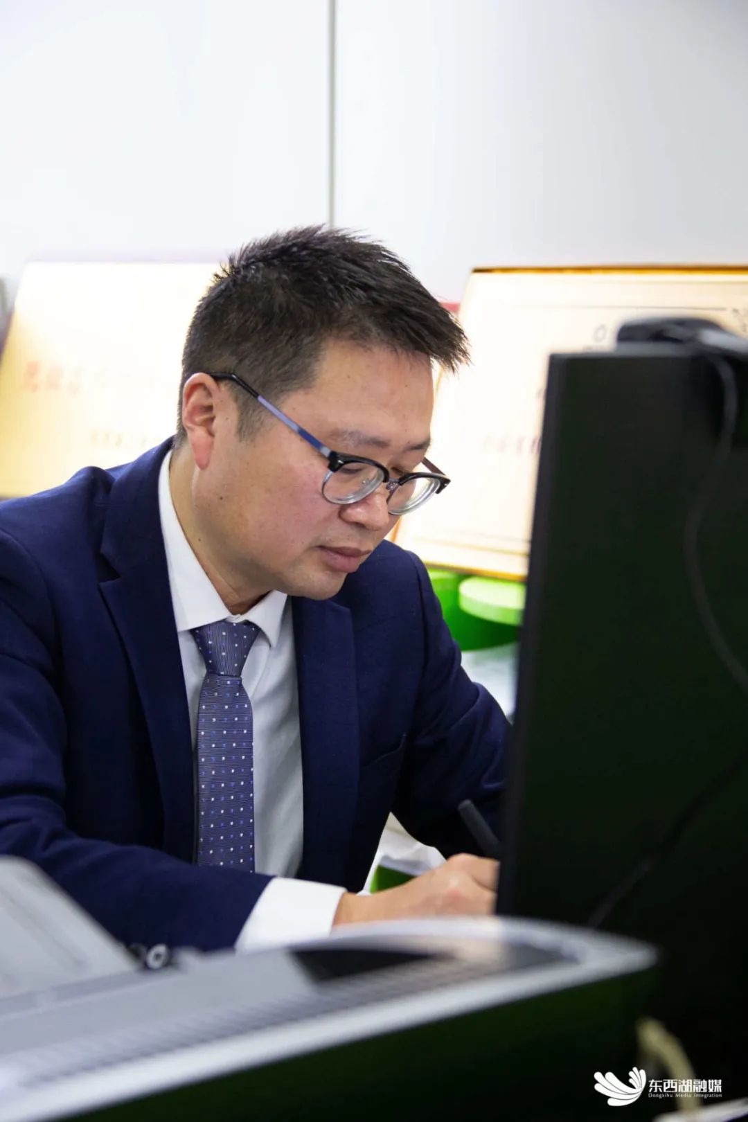 阮征在办公室整理材料。