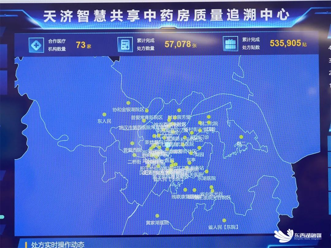 天济智慧共享中药房质量追溯中心电子大屏上,显示着当日接入处方总数、实时配送方式等统计数据。