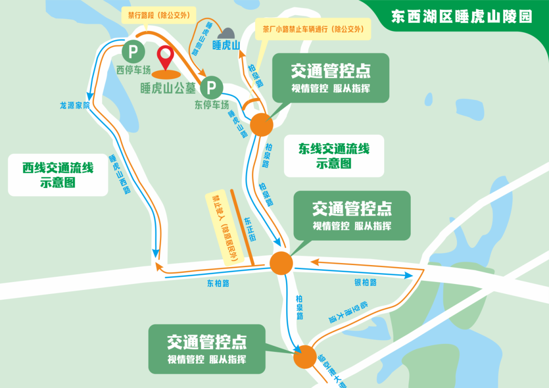 睡虎山路、睡虎山侧路实行机动车由北向南单向通行(持证车辆除外);柏泉路睡虎山路口(原睡虎山三岔路口)禁止机动车由南向北驶入睡虎山路,前往睡虎山墓区的机动车一律由柏泉路、睡虎山侧路进入。