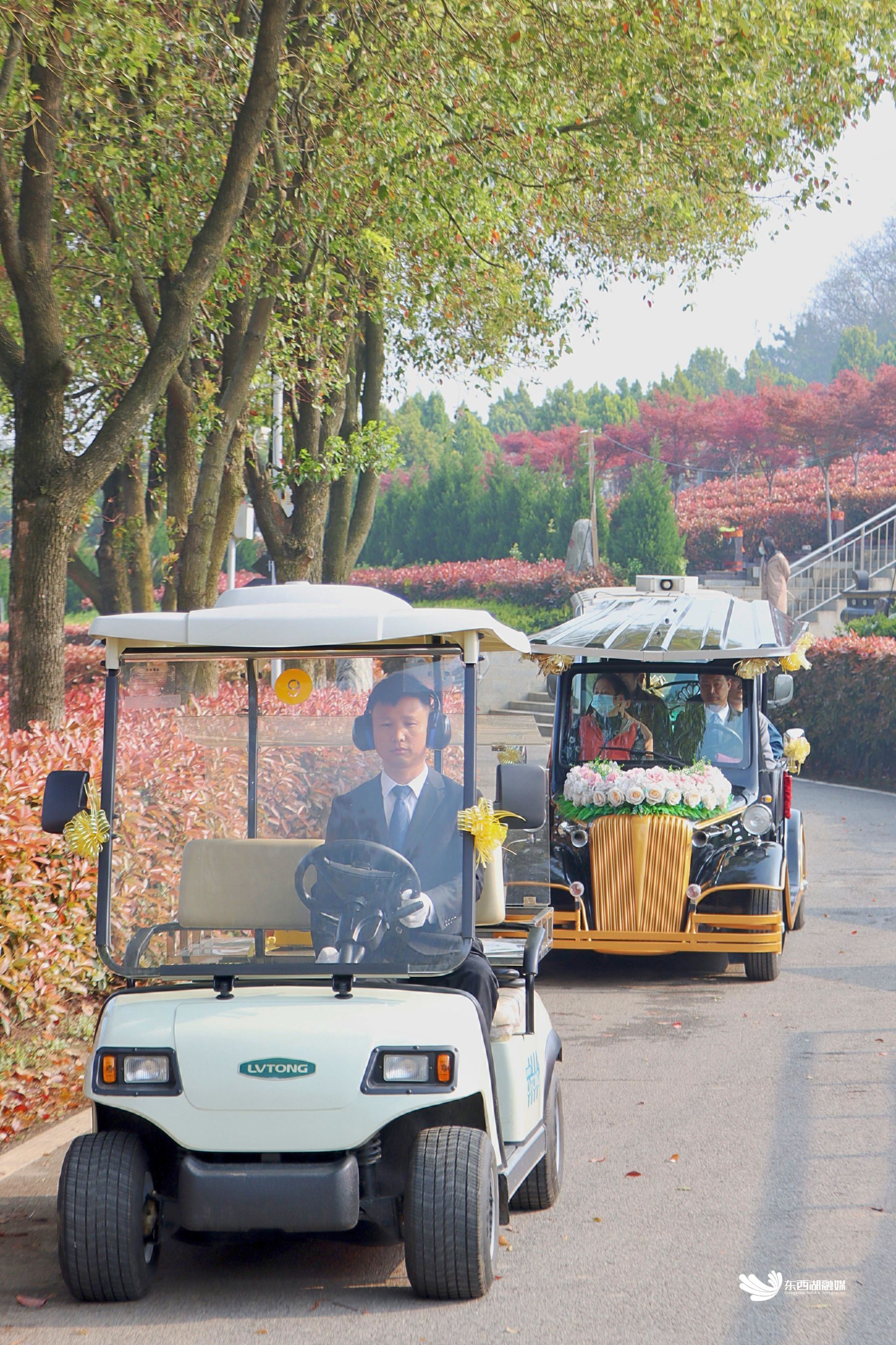 花车送逝者及家属前往花坛葬仪式现场。