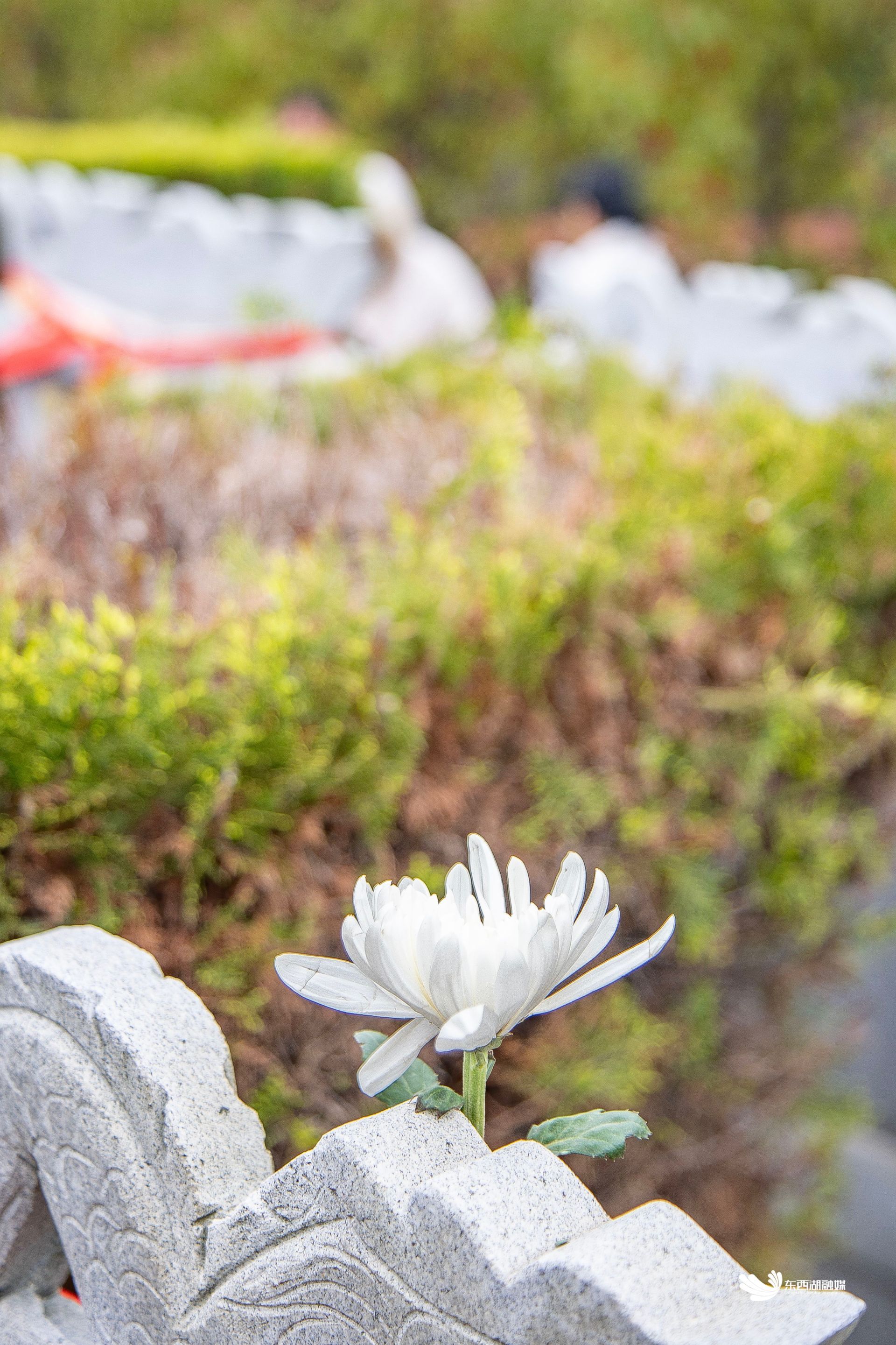 落葬仪式后,家属在花坛上献上鲜花。