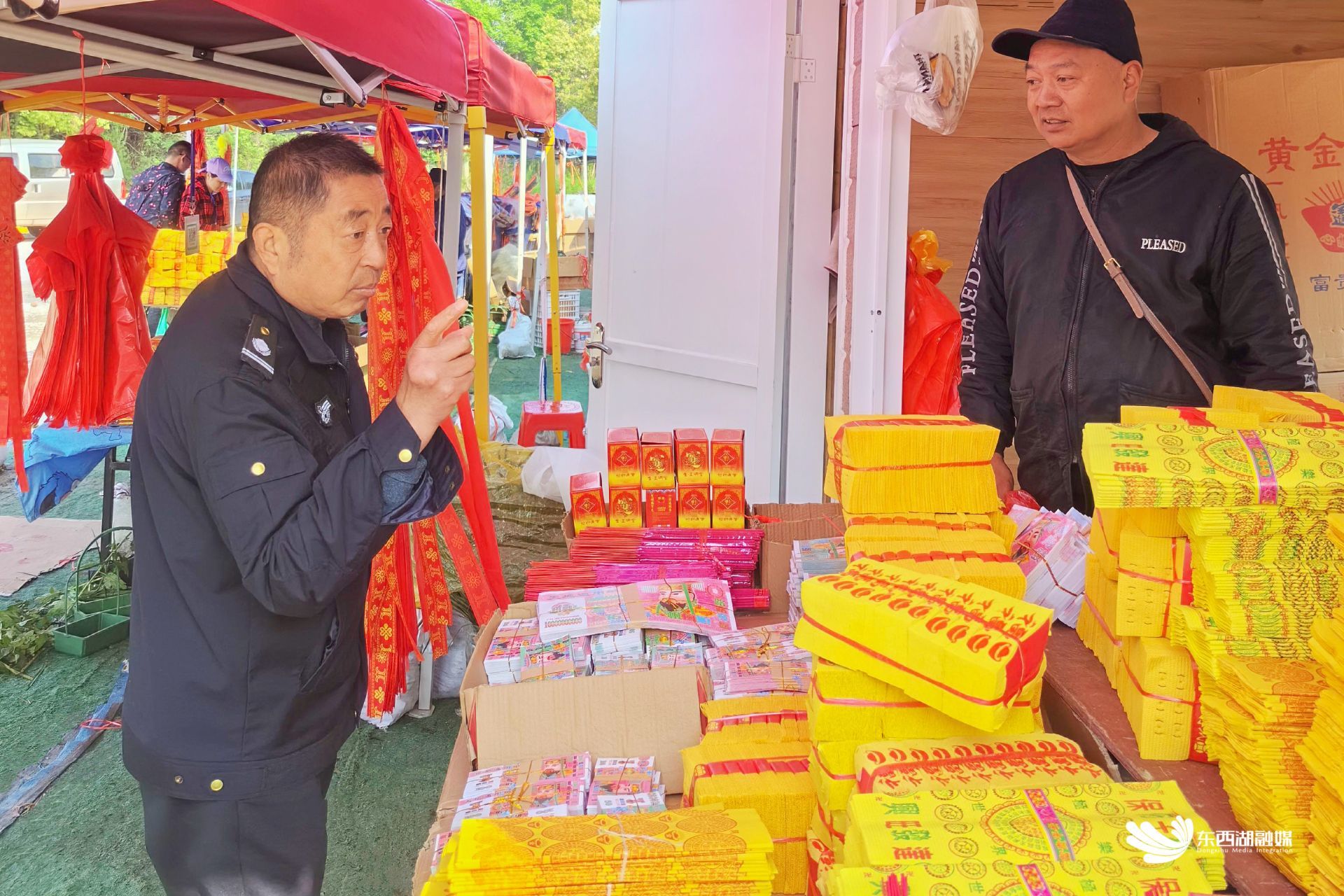 记者在睡虎山路的睡虎山公墓祭祀用品市场看到,售卖祭祀用品的便民摊位一字排开,市民有序地在摊位前购买祭祀用品。记者向柏泉街了解到,该市场由柏泉街在2023年清明节前期搭建,将祭祀用品集中规范管理。去年,投入使用的便民摊位有效解决了流动商贩占道问题,得到了群众的好评。今年,街道在东、西两个停车场旁共设有50余个便民摊位,每天清晨6点,工作人员都会准时到达睡虎山公墓祭祀用品市场,挨家挨户巡查,规范商户物品摆放情况,为清明祭祀做好保障。