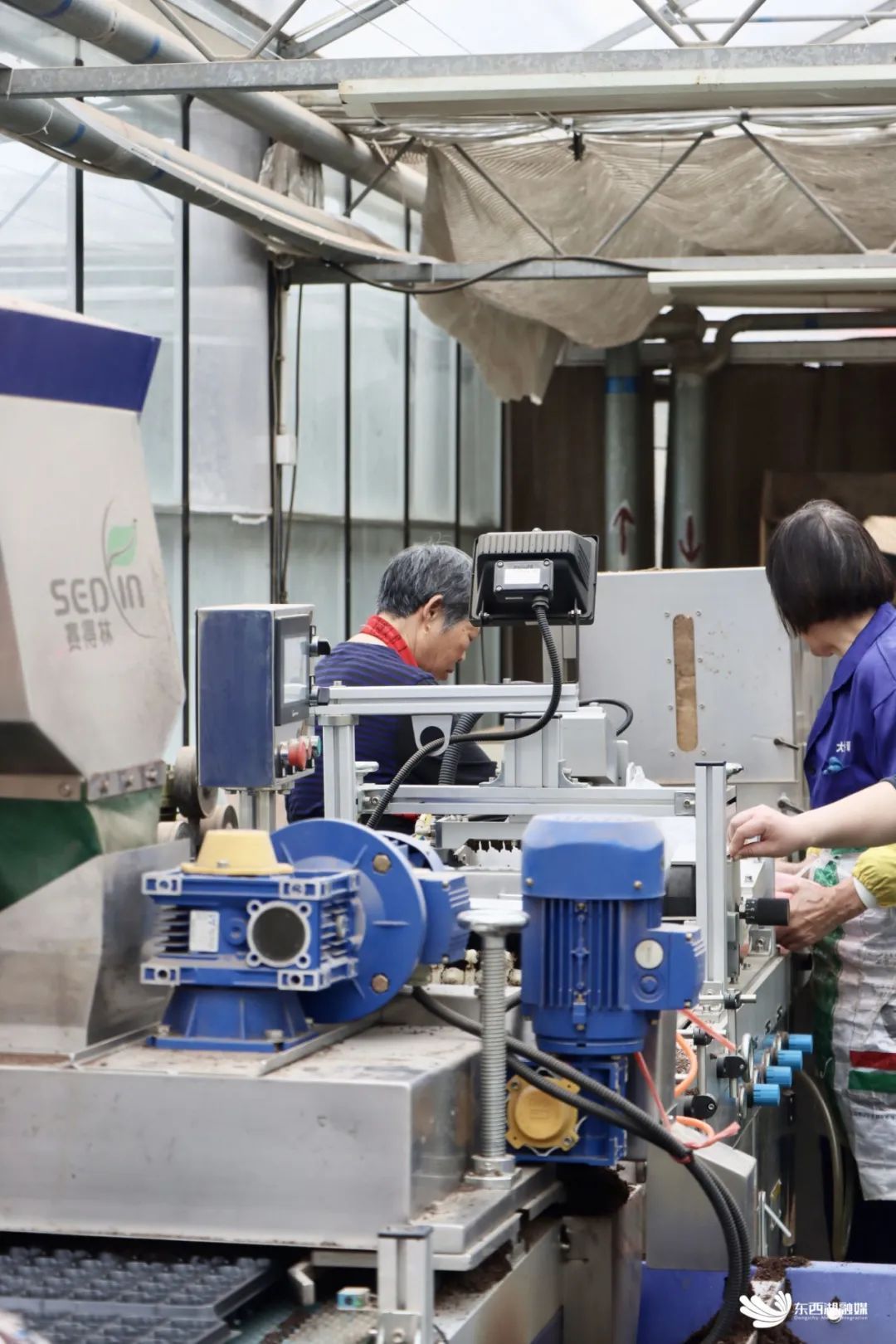 工作人员操作气吸滚筒式穴盘精量播种机育苗。
