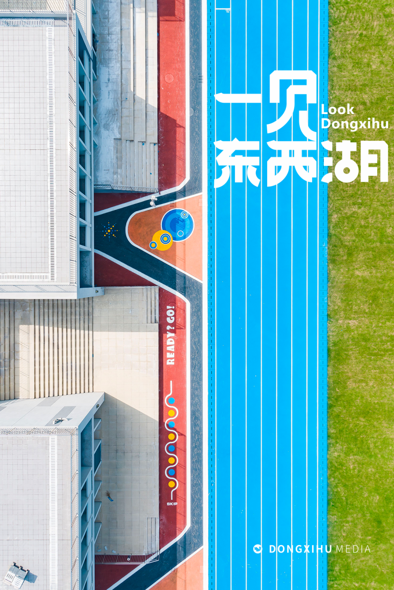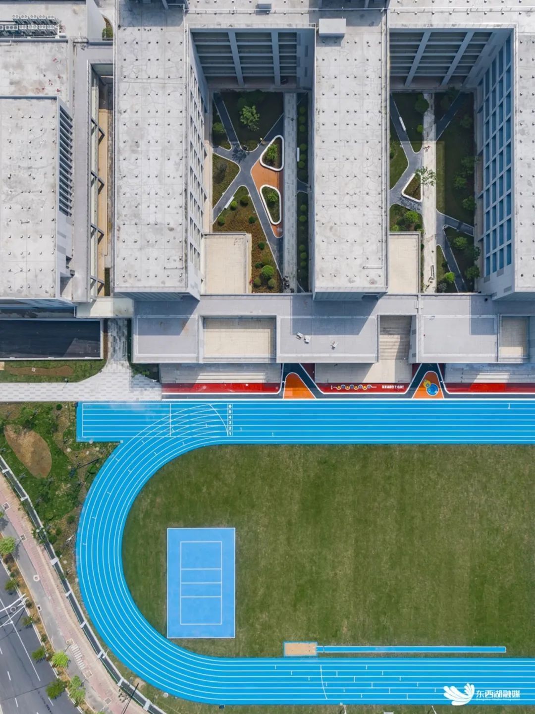 校内沿通透围墙,建有标准赛道户外运动场、足球场;校园北端,两个标准篮球场呈东西向并列,配足了锻炼与运动空间。