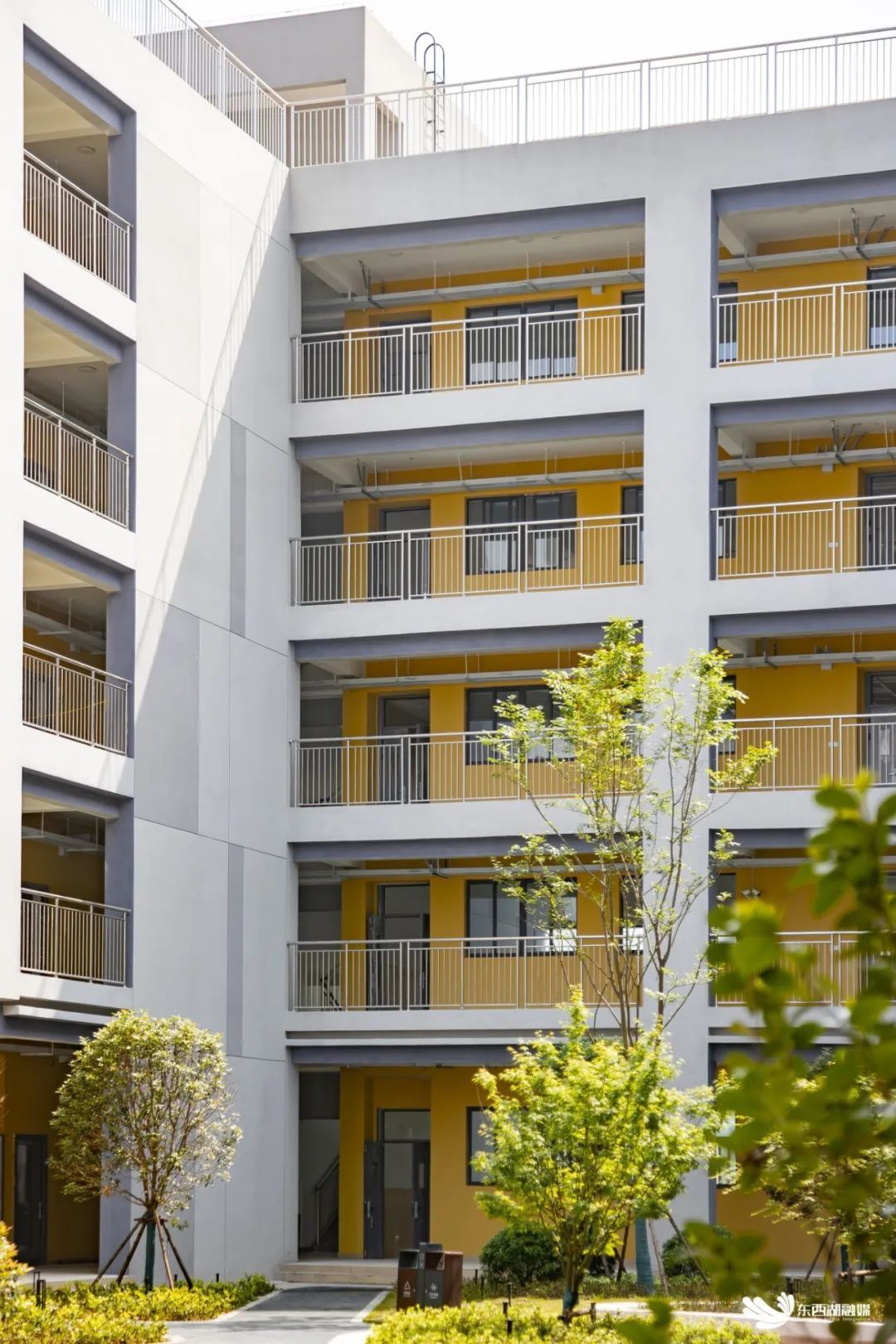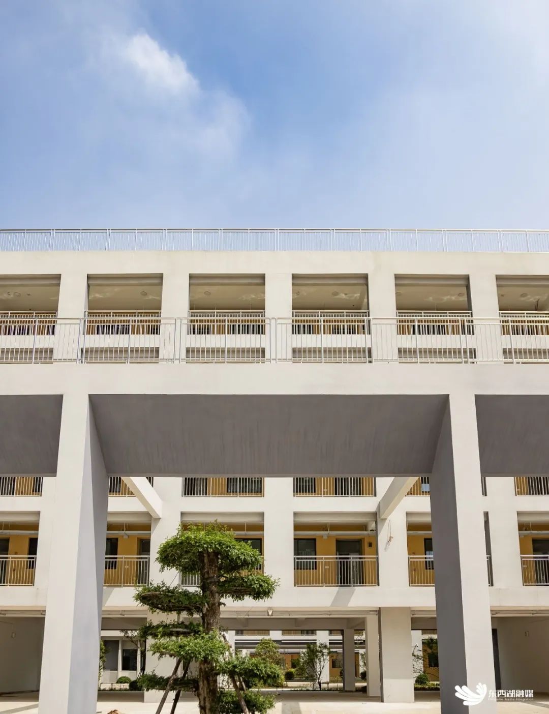 从智雅路主入口步入校园,只见树木葱绿、月季正艳,满目旺盛茁壮的景象。教学楼通体为浅灰色建筑,教室外墙采用吸睛的黄色,洋溢出青春的活力。