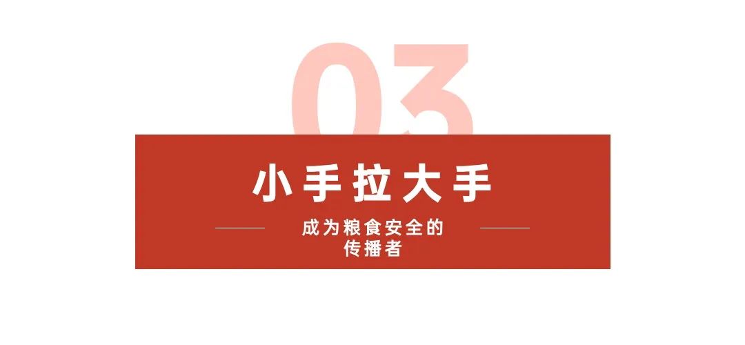 在王桃香倡导下,学校开展“大手拉小手”活动,发起“家庭光盘行动”,倡导家庭小盘菜,节约每一粒粮食,在节假日组织学生们开展劳动小视频比赛,指导学生进行家庭绿色种植,邀请学生家长参加“生态与粮食安全俱乐部”活动,将粮食安全教育宣传融入到学生家庭,让学校粮食安全教育转化为社会文明进步的靓丽风景线。