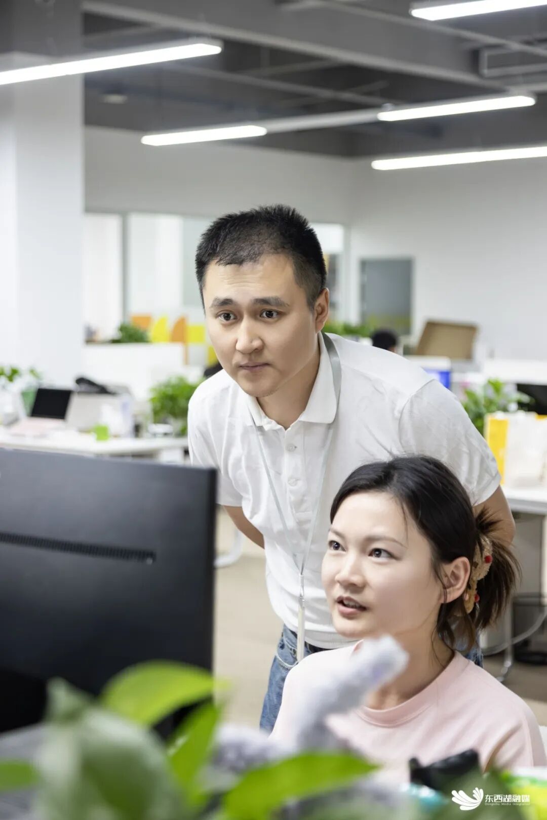 何鑫(站立者)与工程师沟通项目细节。