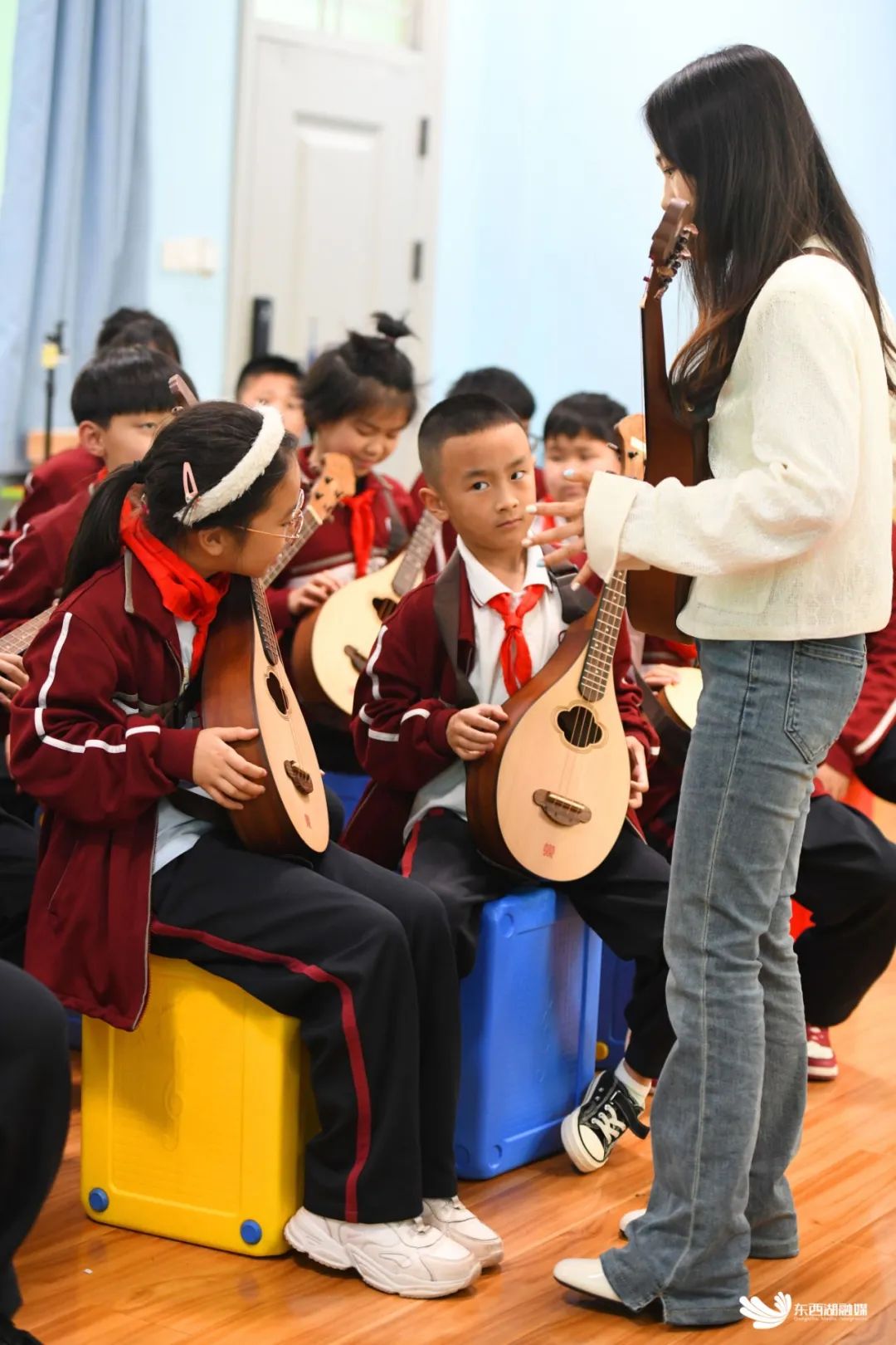 而今天,他们要用礼乐弦歌四弦琴“复刻”这段旋律。话音未落,另一位音乐老师金雨含已将四弦琴分发给每个学生。随后两位老师携手,分组指导学生。