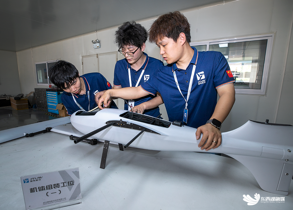 5月6日,东西湖区海口电力工业园区内,武汉捷特航空科技有限公司(以下简称“捷特航空”)组装车间,一架翼展5米的长航时卫通复合翼无人机JT500即将下线。作为全国应急救援无人机行业新标准颁行后首单招投标产品,该机将于近日送抵河南。