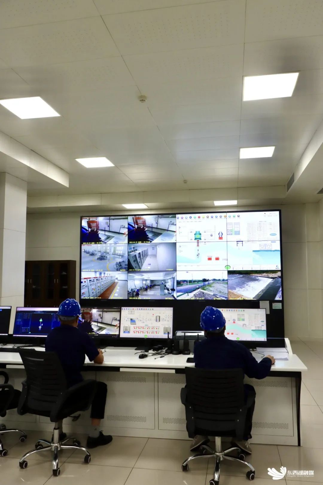 泵站中央控制室内的工作人员正在实时监控。