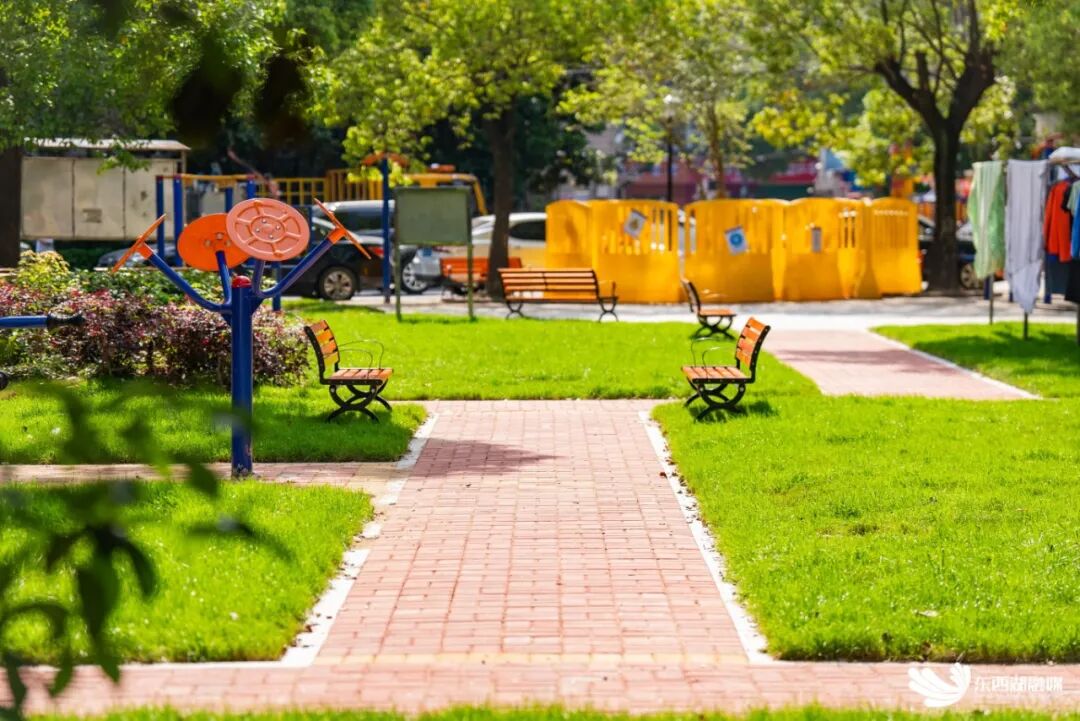 因此,原有的休闲广场进行了“适老化改造”,广场上铺设了1000平方米的果岭草,可散步的硬化路面错落其中,新安装了10座带靠背的休闲座椅,增加了健身器材,景观设计采用大量橙色搭配蓝色、白色等欢快亮丽色彩,让老人们觉得眼前一亮。小区部分地砖老化、道路破损等问题也在本次改造中一并得到解决。